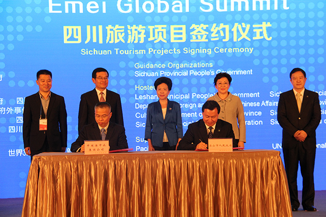 在簽約儀式上,港中投總經(jīng)理許慕韓與樂山市張彤市長簽訂了「關(guān)于合作開發(fā)樂山市、峨眉山市旅游資源的戰(zhàn)略合作協(xié)定」。姜巖總經(jīng)理與四川省黃彥蓉副省長、省旅游局郝康理局長和樂山市委唐堅(jiān)書記作為證簽人見證了雙方協(xié)議的簽署。